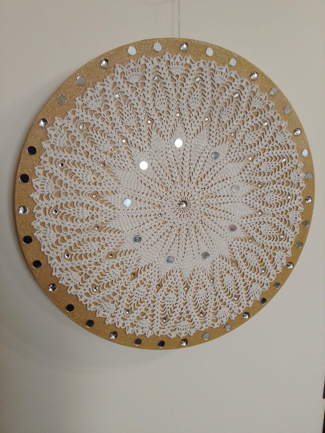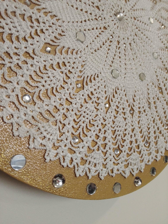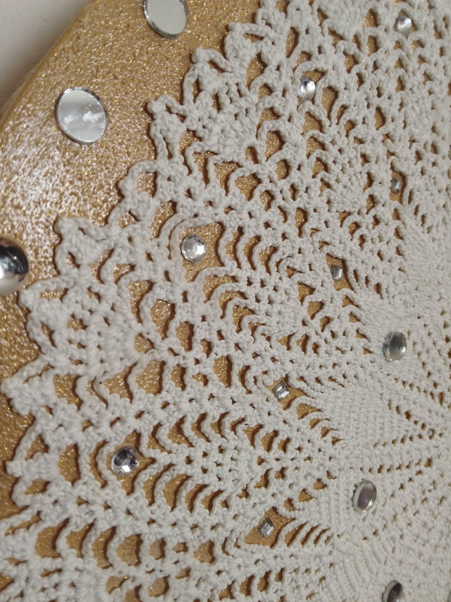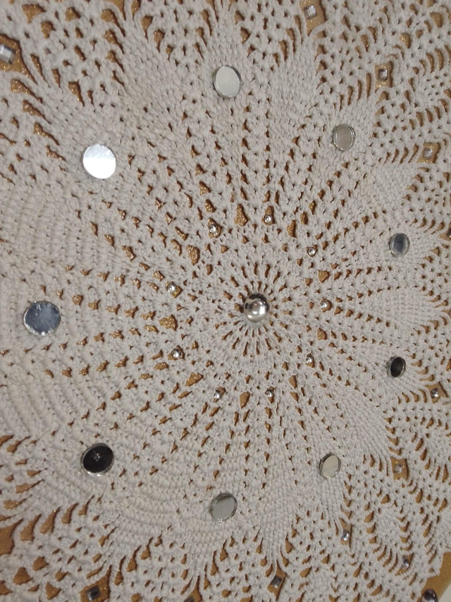Napperon ancien collé en coton blanc 34.5 cm, déco cabochons et strass verre couleur cristal et petits miroirs ronds.
